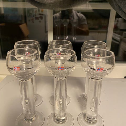 Magnor Glassverk Snapsglass 5 stk, klart glass med norsk flaggtrykk. Egnet for servering av snaps og andre smådrikker.