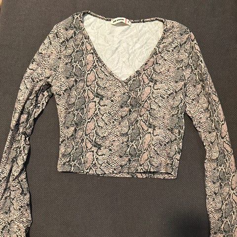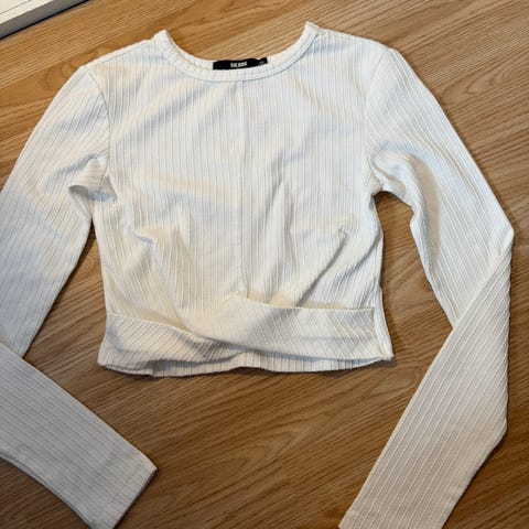 Magetopp med høy hals og lange ermer selges, fordi jeg ikke bruker den. Størrelse XS og stripete mønster. Genseren har en ribbestrikket tekstur.