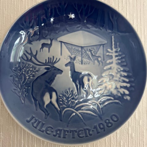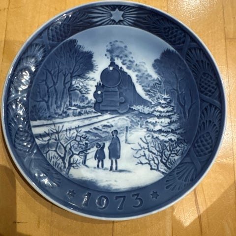 En juleplatte fra Copenhagen Porcelain, med motiv «Gensynet juleaften» fra 1976.