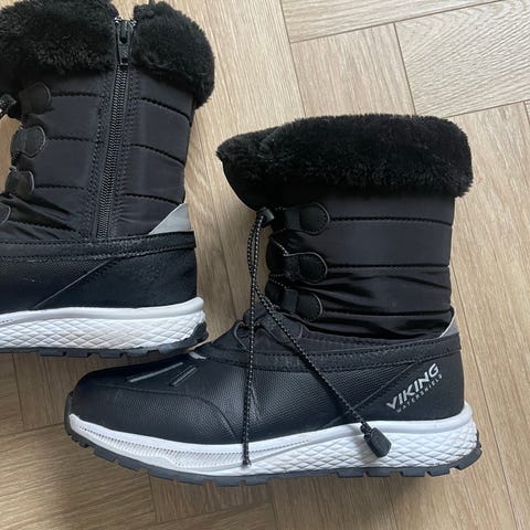 Viking barn vinterstøvler i størrelse 36, designet for jenter. Støvlene er grå med fôr av mykt, isolerende materiale for varme og komfort. De har snøring foran for justerbar passform og en solid yttersåle for godt grep. Egnet for bruk i kalde og våte forhold. Støvlene har noe slitasje i front. Nye i fjor vinter.