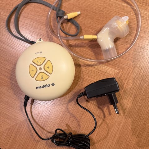Medela Swing elektrisk brystpumpe i hvit farge. Produktet inkluderer pumpeenhet, strømforsyning, og tilbehør for pumping. Designet for enkel og effektiv pumping, egnet for mødre som ønsker å pumpe brystmelk. Kan brukes med strøm eller batteri. Batterier følger ikke med.