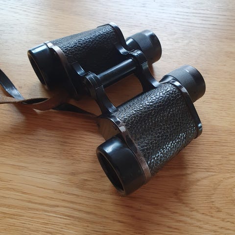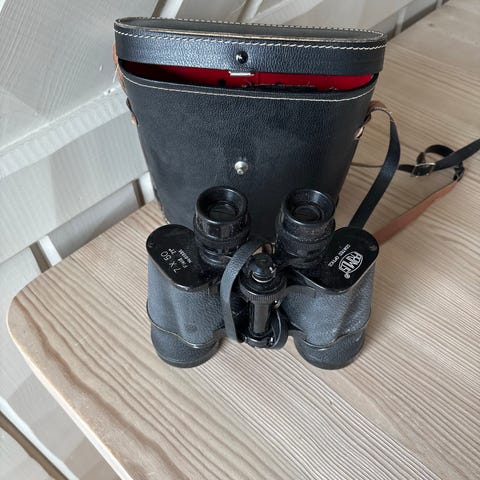 Altex Paris kikkert med svart metall- og glasskonstruksjon. Kommer med et beskyttende etui i svart skinnmateriale.