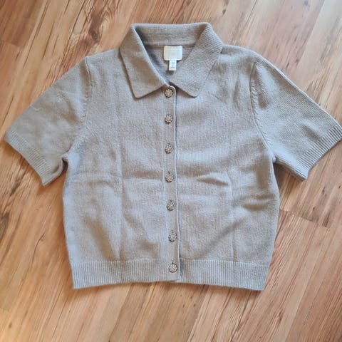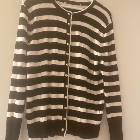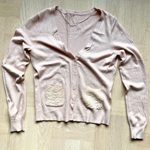 Cardigan fra Summum. Lite brukt. Stilig i fargene med rødt, cerise, lys rosa og beige. Dyp v-ringning med cerise knapper nederst.