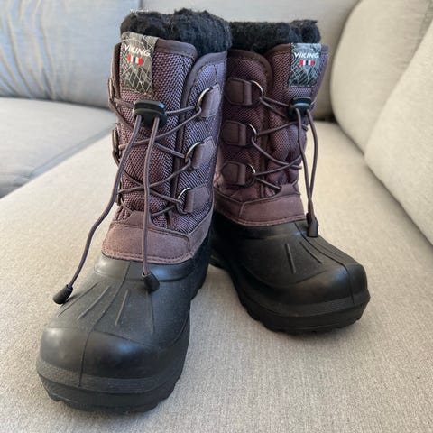 Viking barn vinterstøvler i størrelse 35, unisex design. Støvlene har en lilla og svart fargekombinasjon, med vanntett materiale og isolasjon som egner seg for kalde og våte forhold. Egnet for utendørs bruk i vintervær.