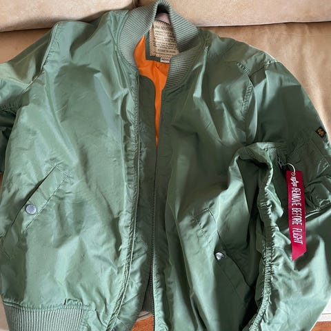 Alpha Industries Inc bomberjakke str. M selges. Romslig i størrelsen. Svært lite brukt, som ny