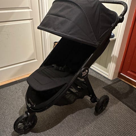 Baby Jogger City Mini barnevogn i svart farge. Barnevognen har tre hjul, justerbar sitteposisjon, solskjerm og oppbevaringskurv under setet. Egnet for barn fra spedbarnsalder og oppover, designet for enkel manøvrering og komfort under turer. Babybag og adapter til bilstol fåes kjøpt separat.