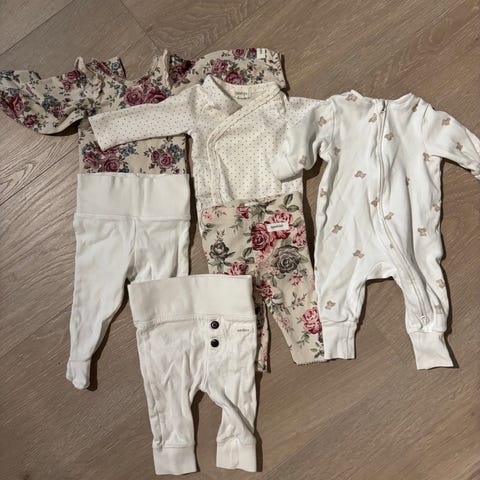 To søte pysjer fra KappAhl og to supermyke bodyer. Pysjene er lite brukt og fremstår som nye. Bodyene er kjøpt på Tise, men ikke brukt av meg. Noe nupper på den ene, men begge er fortsatt kjempefine. Alt er størrelse 56.