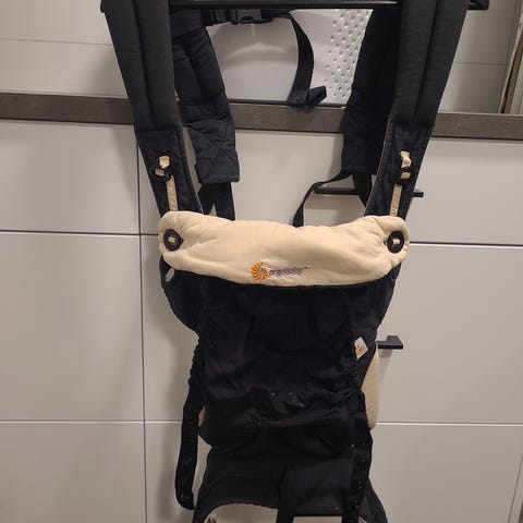 Selger en Ergobaby bæresele, spedbarnsinnlegg og et beskyttelsestrekk mot vær og vind.