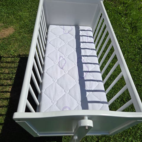 Selger pent brukt grå barneseng med madrass. BxLxH: 67x125x85cm. Må hentes, er demontert.