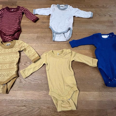 Klespakke med fire pent brukte bodyer i str. 3-6 mnd. selges.