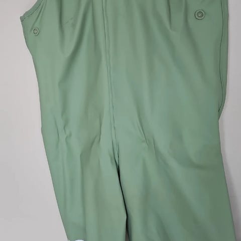Grønn regnbukse str 80. Strikkene har blitt litt slappe.