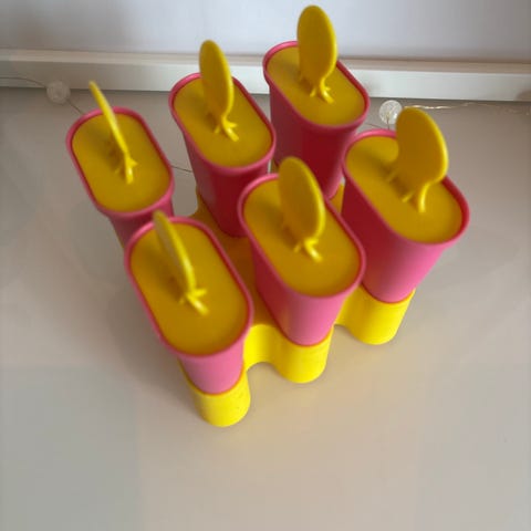 Med disse formene kan du enkelt lage din egen is. Bare fyll dem med saft eller fruktyoghurt, sett i pinnen og legg dem i fryseren i noen timer.
