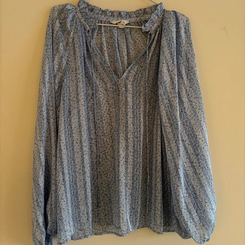 Topp med slangeskinnsmønster, nyanser av brunt/beige. 100% viscose. Det er knapp bak i nakken og på mansjettene. V-hals og en fold foran i fronten.