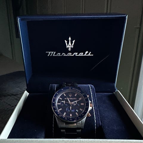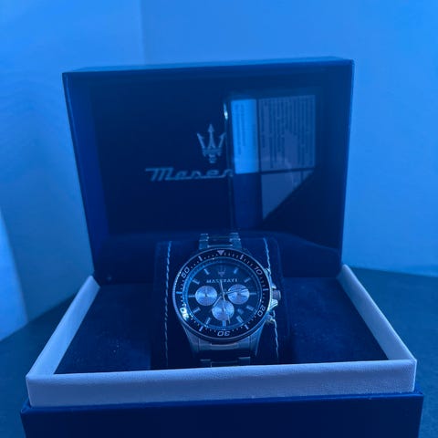 NY,safirglass,kronograf, 100m, 24 diamanter,skrukrone,blå lærreim,garanti.