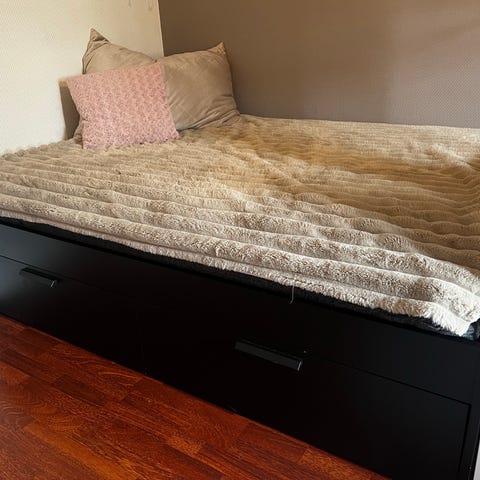 IKEA Brimnes seng med oppbevaringsskuffer under sengen. Brukt som gjesteseng. Lite brukt. Har vært et trekk på sengen hele tiden, men kan ikke utelukke hår fra katt.