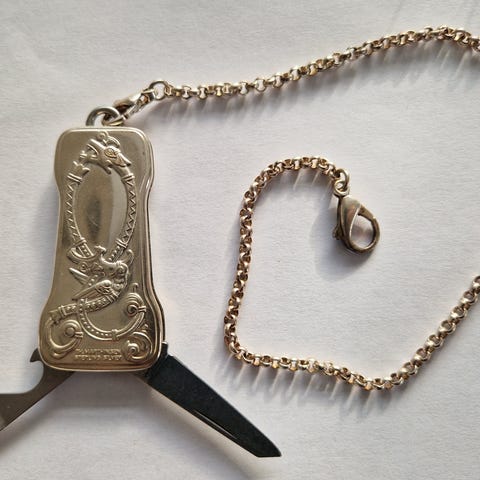 Smykketollekniv som bl.a. kan brukes til bunad, består av en kniv med skaft av håndslipt thulittstein og håndlaget lærslire. Sølvarbeidet er utført og designet av sølvsmed og gravør i 830S.