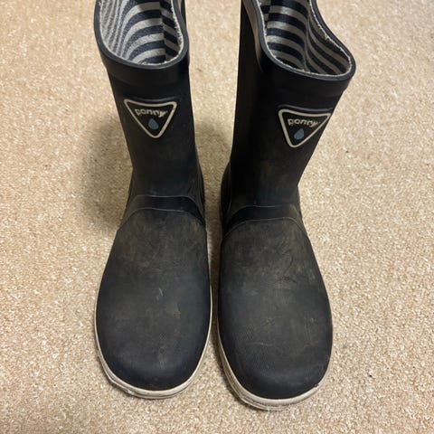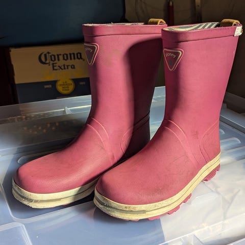 Pony barnestøvler i størrelse 36, farge rosa. Støvlene er laget i gummi med en innside som har stripemønster. Egnet for barn, spesielt til bruk i vått vær.