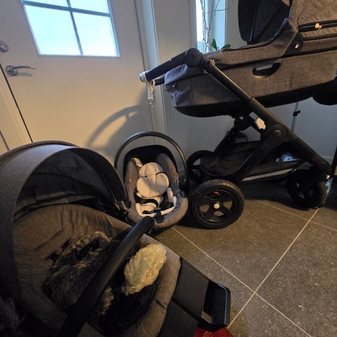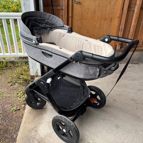 Stokke Trailz barnevogn fra 2020. Vognen inkluderer enveøsig pent brukt bagdel (grey melange) og sittedel (sort). Bøyle følger med sittedelen, men er ikke montert på bildet.