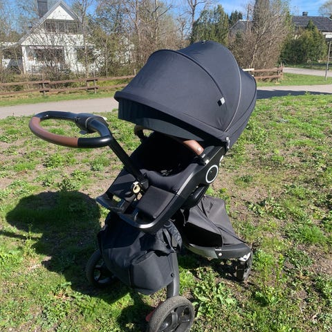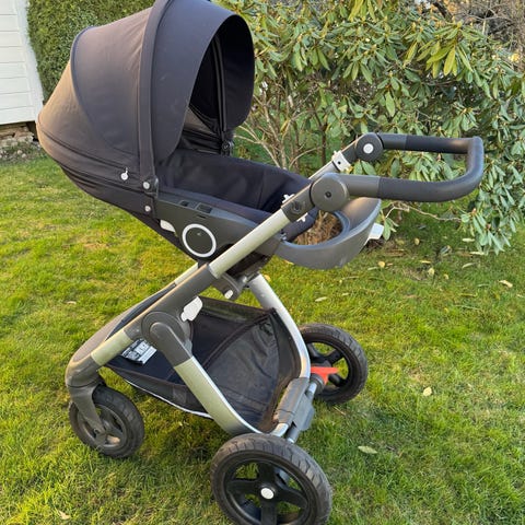 Stokke Trailz barnevogn fra 2020. Vognen inkluderer en veldig pent brukt bagdel (grey melange) og sittedel (sort). Bøyle følger med sittedelen, men er ikke montert på bildet.