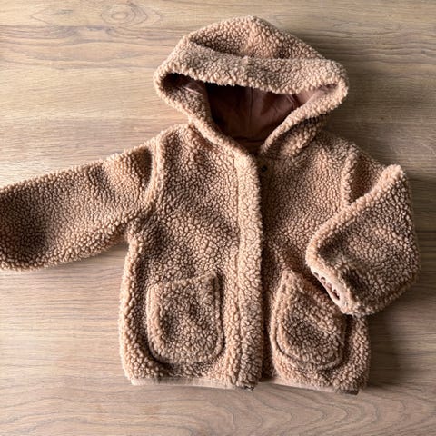 Selger en brun teddyjakke fra Mini a Ture! Den har fått noen nupper på ermene og i kanten ved glidelåsen, men ingen slitasje ellers!