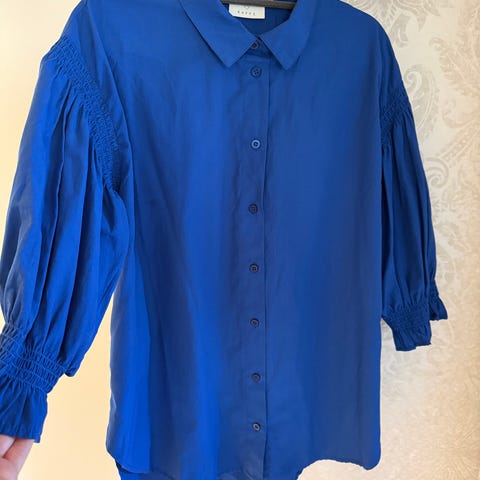 Mange fine detaljer, skjulte knapper, bua nede, «crispy» stoff, stretch, 97% bomull, spesielle mansjetter med strikk, liten puffarm.