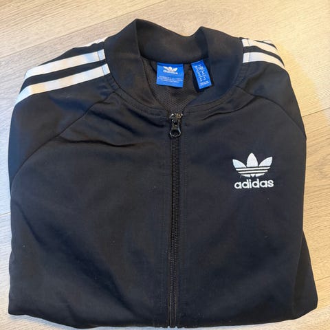 Adidas jakke for dame i størrelse S. Jakken er beige med svarte striper langs ermene. Lommer med glidelås.