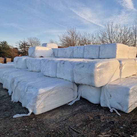 Mattene er lagret utendørs på paller i Kristiansand.