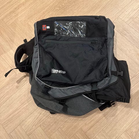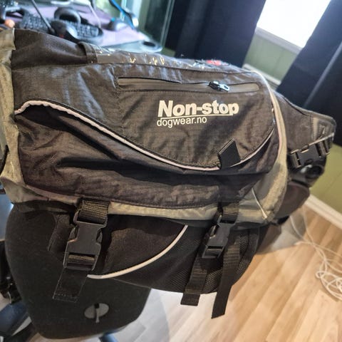 Ny og ubrukt Breeders Hundekløv Bæreveske i rød og grå farge, laget av slitesterkt materiale. Passer til transport og oppbevaring av det man tenker at hunden skal få bære. Utstyrt med diverse lommer, stropper og regn topp, Mål og spesifikasjoner er vist på bildene.
