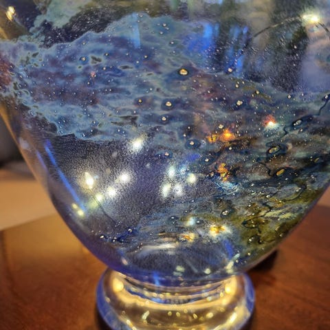 Dette er mest sannsynlig en håndblåst glassvase fra Hadeland Glassverk, designet av Severin Brorby. Vasen er fra 1970-tallet og har et motiv av gjess i flukt.