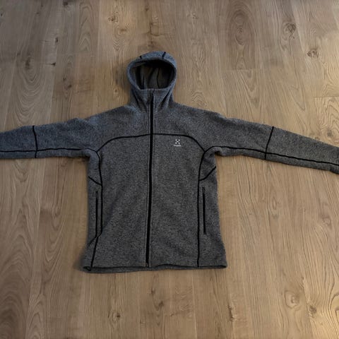 Haglöfs Fleecejakke i størrelse M, designet for kvinner. Jakken er lys grå og laget av fleece-materiale. Den har hel glidelås og to sidelommer med glidelås. Egnet for ulike typer sport og utendørsaktiviteter.