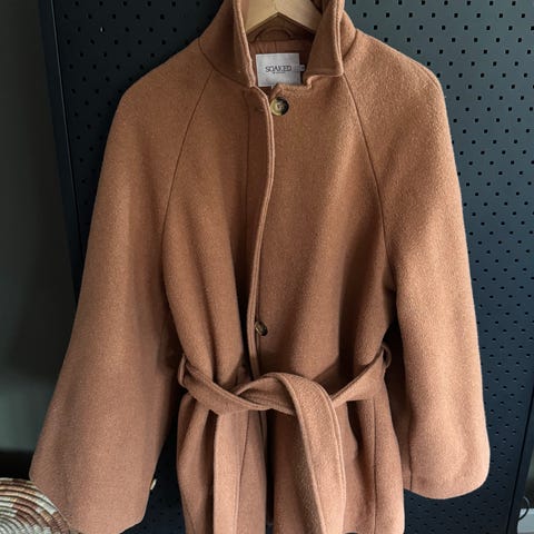 KappAhl jakke i beige farge, størrelse XL. Jakken har belte i livet og dekorative detaljer langs kantene. Materialet og designet gir et komfortabelt og varmt yttertøyalternativ.