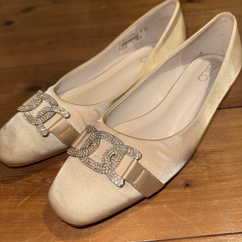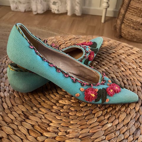 Nydelige Pretty Ballerina sko i størrelse 40. Skoene har et blomstrete mønster i stoffmateriale med en grønn sløyfedetalj foran. Skoene er nærmest som et lite kunstverk.