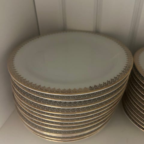 11 kopper, 11 tallerkener. 12 koppetallerkner, kaffemugge, fløtemugge og sukkerskål