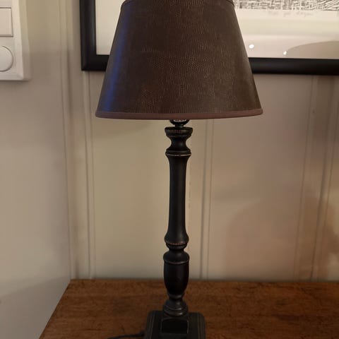 Oval fasong med et «trekk» av skinn. Antar at det er ekte skinn (kalv?) med strutselook og ikke ekte strutseskinn. Lampe av høy kvalitet. Lampeskjermen er fra IKEA og kan følge med hvis du vil.