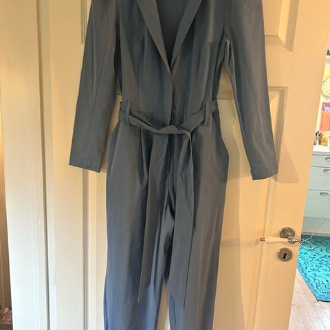 Zara Basic jumpsuit i blå farge, størrelse M. Laget av lett og mykt materiale. Har kortermet design med V-hals og knyting i midjen. Passer for kvinner.