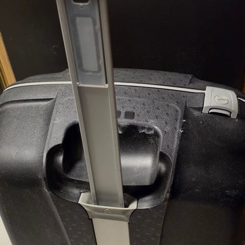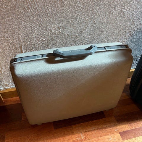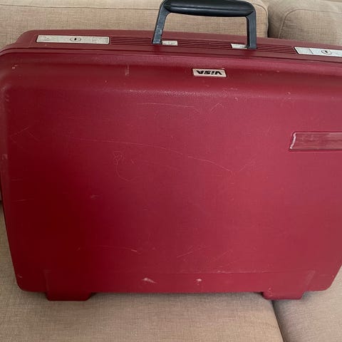 Solid liten plast koffert fra Samsonite i rød farge. Koffert er i god stand. Plastkoffert har praktisk innredning og kodelås.