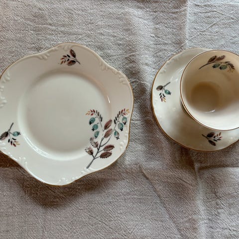 Serviset/skålene er i god forfatning med tanke på alder. De er hele og fine, og har normale bruksmerker. Et lite hakk i den ene skålen, men ikke skjemmende (se bilde). Gullkant rundt er noe slitt.