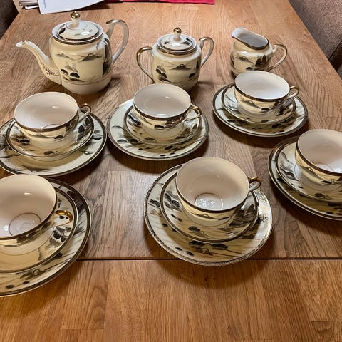 Japansk te-servise , Kutani porselen. 10 kopper, 10 tefat,10 asjetter, sukkerskål med lokk,fløtemugge og tekanne med lokk.