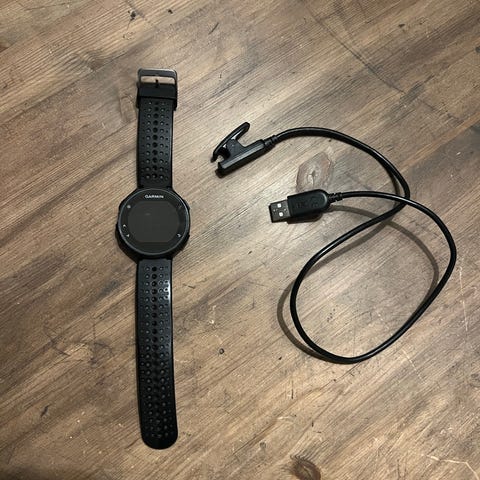 Garmin Forerunner pulsklokke med svart urskive og svart reim. Klokken har pulsmåler på baksiden og leveres med ladekabel. Egnet for trening og aktivitetsovervåkning. Klokken er godt brukt, og bateritiden er i likhet dårligere enn en ny klokke, og selges derfor svært billig.