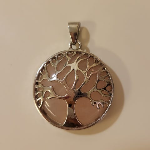 Smykke sett bestående av et rundt anheng og matchende ørepynt med tre-design. Fargen er svart med sølvfargede detaljer. Materialet er ikke spesifisert. Settet inkluderer en kjede til anheng og ørepynt med stiftlås.