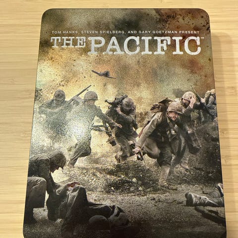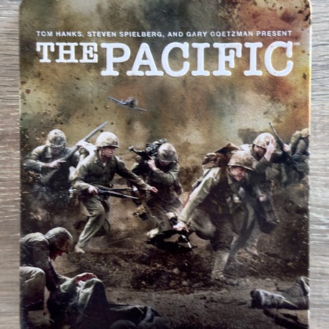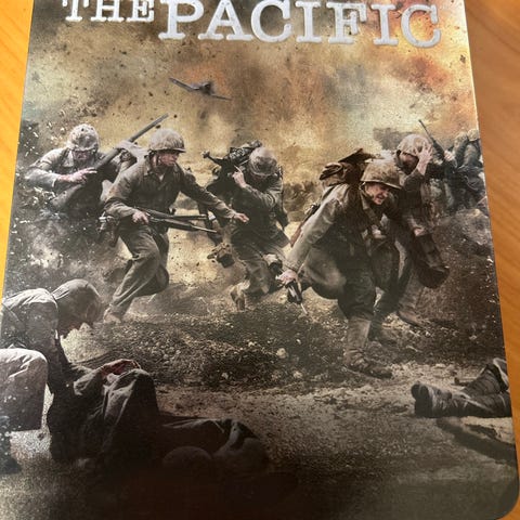 The Pacific DVD komplett sett med flere plater. Serien dekker hendelser fra andre verdenskrig med fokus på Stillehavskrigen. Inkluderer original emballasje og bok med informasjon om serien.