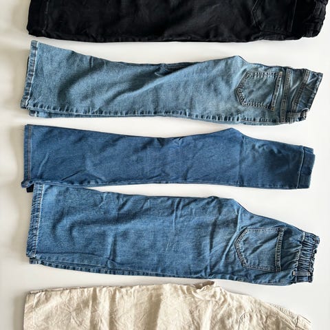 Selger 3 pent brukte bukser, alle str 164. De to beige er fra H&M, dongeribuksa fra Cubus.