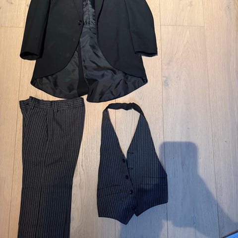 Følger med jakke, bukse, skjorte, sløyfe og magebelte