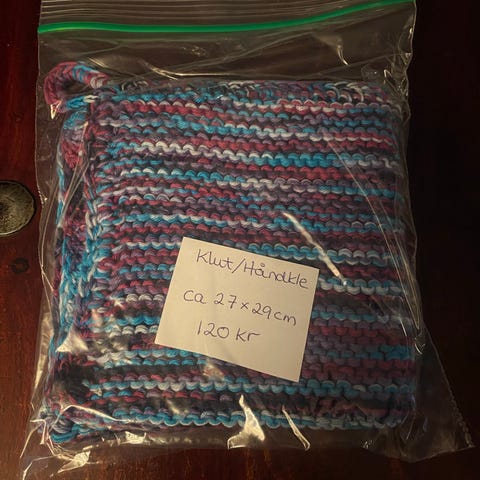 Strikket håndkle ca 25 x 30 cm.