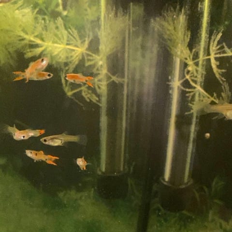 Guppyer gis bort mot henting. Det er de ensfargede guppyene, både voksne og babyer som gis bort. Det er litt usikkert hvilken farge babyene får, kan være at noen av babyene er endlers guppyer. Usikker på hvor mange det er men regner med det er litt over 15stk