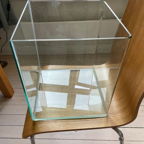 Selger en rund glassbolle i klart glass. Kan brukes både som fiskebolle til småfisk, kampfisk eller andre små dyr. Har hatt min kampfisk i den og den trivdes ganske bra. Kan medfølge bunnsubstrat av glass stein, eller uten, etter ønske. Rommer ca. 7-8 liter.