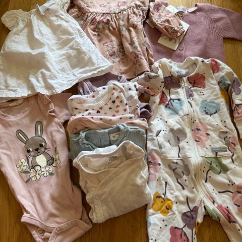 Klespakke til jente str. 56 selges. Inneholder 4 bodyer, 3 bukser, 1 kjole, 1 strømpebukse, 1 hårbånd, 1 par sokker. Pent brukt. Ingen hull eller merker.