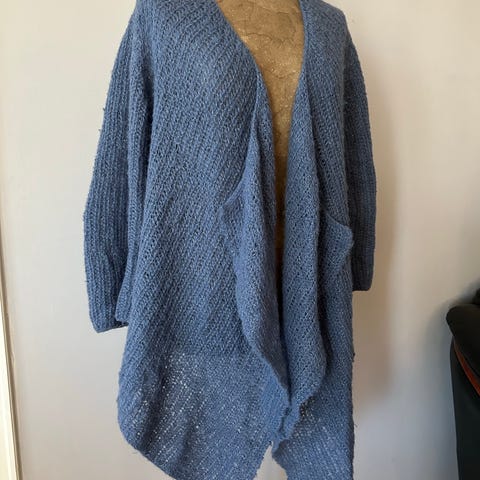 Lang ullcardigan med knepping. 100% mykt ull, hjemmestrikket. Klør ikke. Nydelige blå og grå toner. Lite og pent brukt, ingen bruksmerker utenom et lite synlig hull på baksiden (se bilde). Hentes i Lørenskog