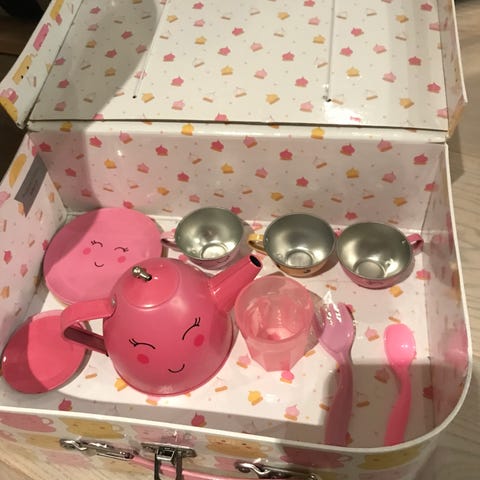 3 tekopper med gullkan og pynt med bokstaver «love». Har følges med små tallerkener til te pose. Selges samblet for 150kr
