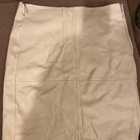 Helt nytt skinnskjørt. Lys grå farge. Midje 43 cm, lengde 55 cm. Klassisk midi-modell.